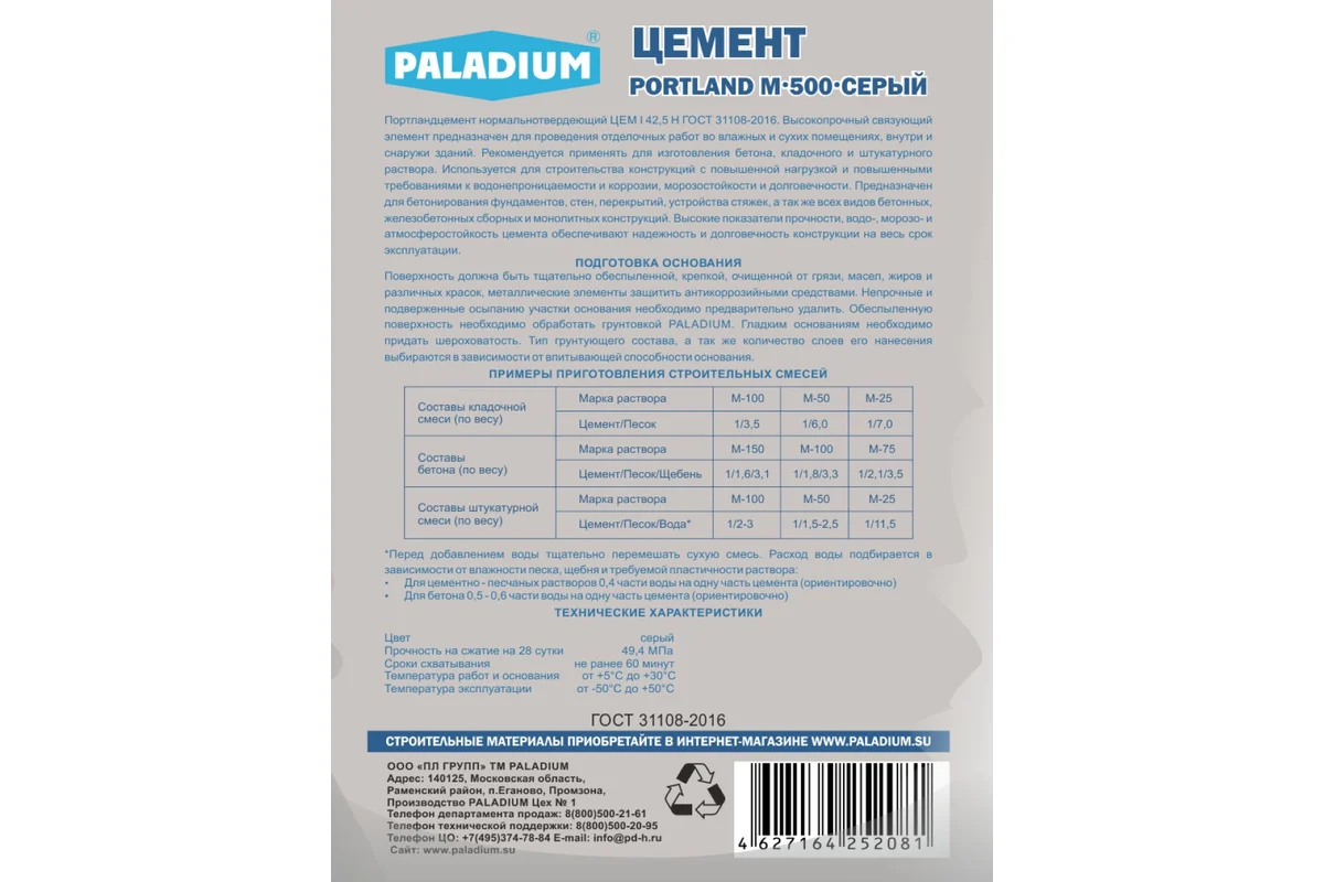 Цемент PALADIUM PORTLAND М-500 (серый; 5 кг) PL5-CM предназначен для проведения отделочных работ во влажных и сухих помещениях, внутри и снаружи зданий. Рекомендуется применять для изготовления бетона, кладочного и штукатурного раствора. Используется для строительства конструкций с повышенной нагрузкой и повышенными требованиями к водонепроницаемости и коррозии, морозостойкости и долговечности.
